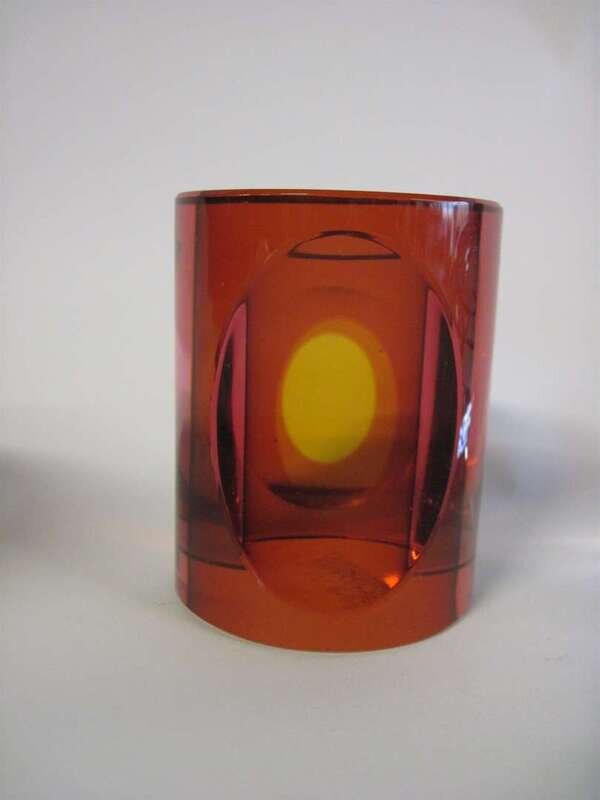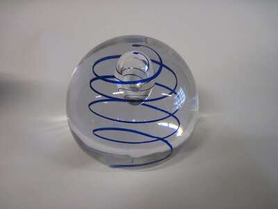 Comprising a Kosta clear glass with blue and green with air bubbles; a Kosta amber and yellow cased glass cylinder; a Kosta clear with teardrop and blue spiral; a Kosta cylindrical jar with brown concentric ring cover; and a Swedish clear glass with bubbles.(5).