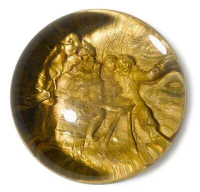 The gilt background with a relief scene of five men in a tavern, with a tin backing.