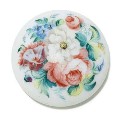 Flattened form and painted with roses and other flowers.