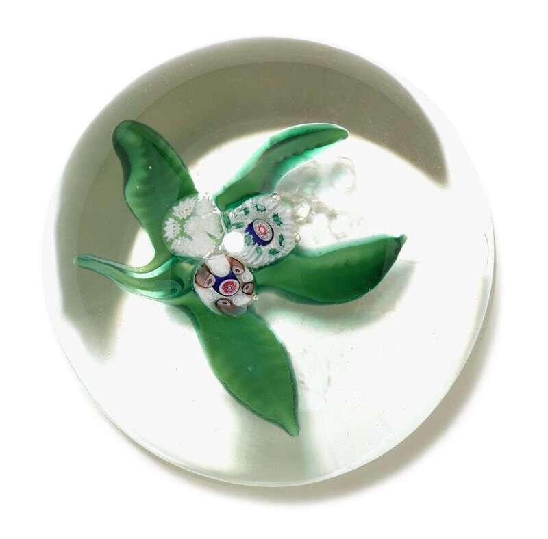 With three millefiori flowers and four leaves, in clear glass.