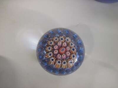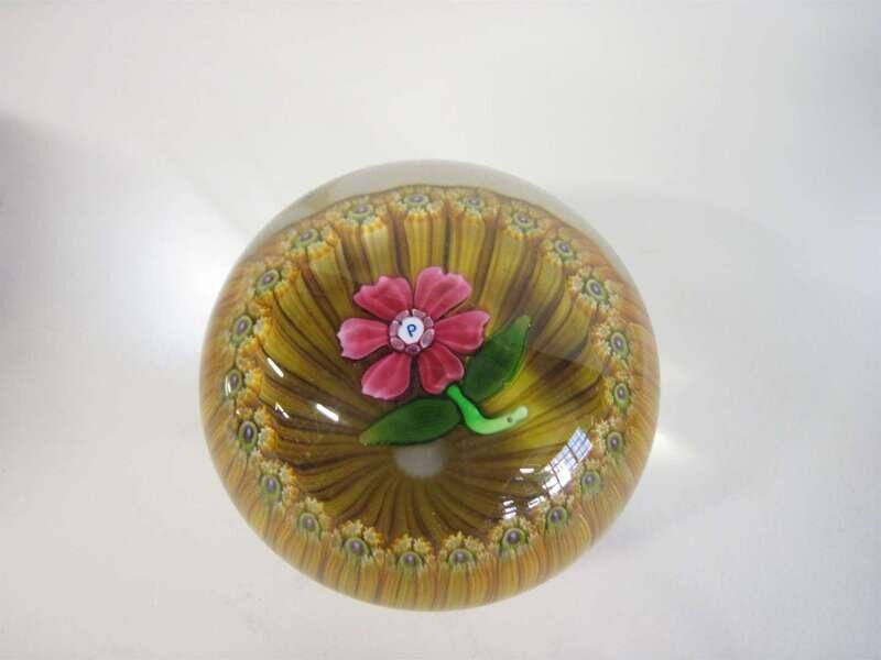 Comprising a six petal white flower and two buds with stems, 'P' initial cane, on a lavender ground; a variegated purple and white African orchid in clear glass; a millefiori in blue and green, 'P' initial cane; a miniature quarter field millefiore with twisted ribbons, date cane 1983; a miniature pink flower with 'P' initial cane center in a band of yellow; and a miniature concentric circles.(6).