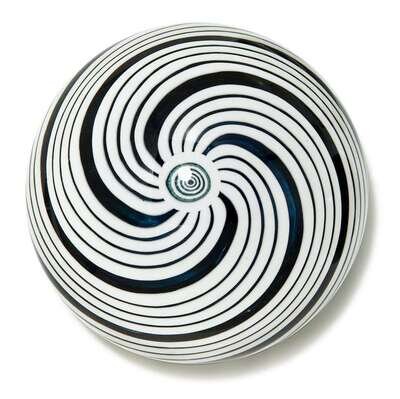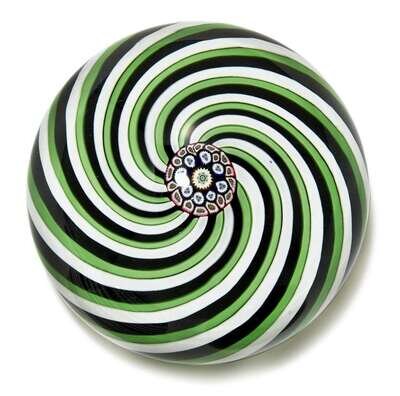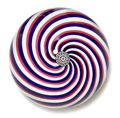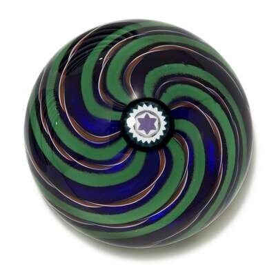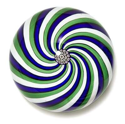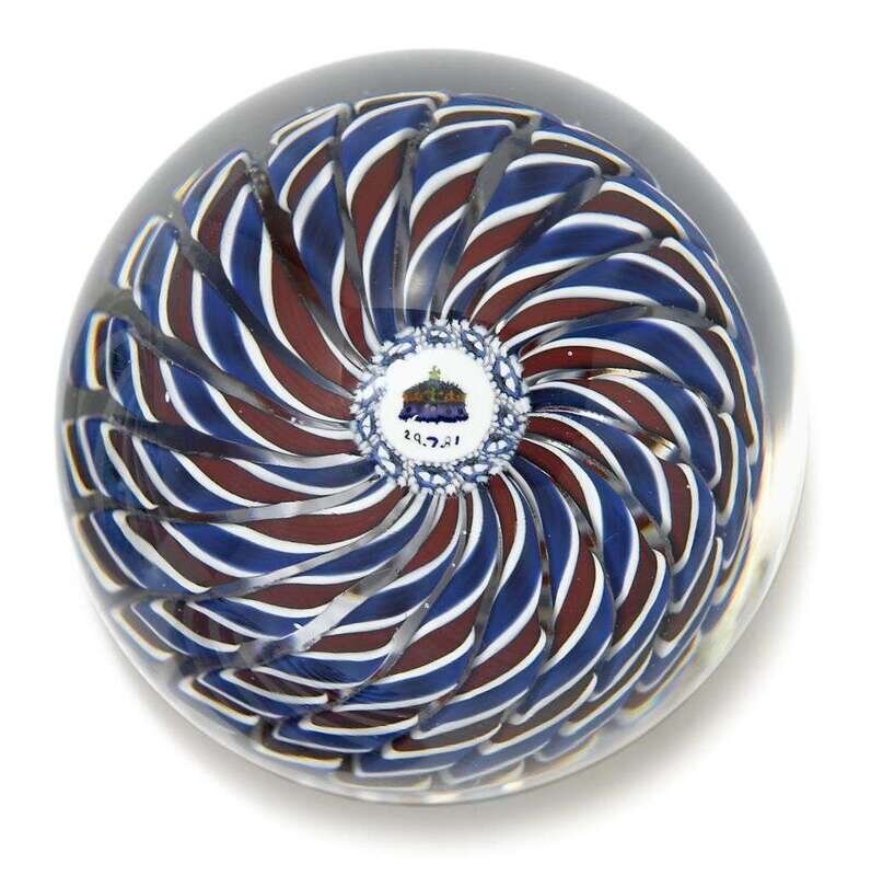 Comprising a blue, white and green spiral with 1980 date cane; a black, white and green spiral with 1980 date cane; a pink, white, and blue spiral with 1980 date cane; a white and blue spiral with initial 'P' cane; a blue and green spiral with red twisted canes and 'P' initial cane; and a red, white and blue twisted spiral Royal Wedding commemorative centered by a crown and date 12.7.81 and 1981 date cane.(6).