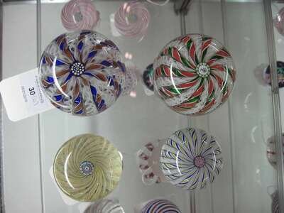 Comprising a Crown Christmas with red and green ribbons and white latticino, date cane 1985; another Crown with blue and red ribbons and white latticino, date cane 1969; a small Crown with blue and yellow ribbons and white latticino; and a Crown swirl with pale pink and green spirals with yellow filigree; all with 'P' initial .(4).