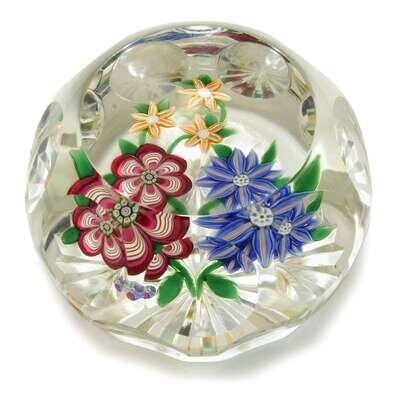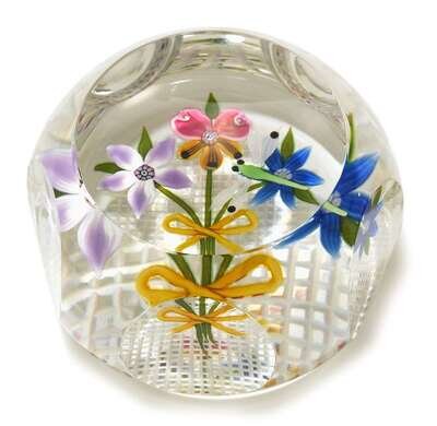 The first with a dragonfly over a bouquet of a pansy with 'P' initial cane center, a purple flower, and a blue flower, tied with a yellow ribbon, in clear glass with a diamond cut base; the other with a blue flower, red and white flower, and three small yellow flowers and leaves, initial 'P' cane, in clear glass on a star cut base.(2).
