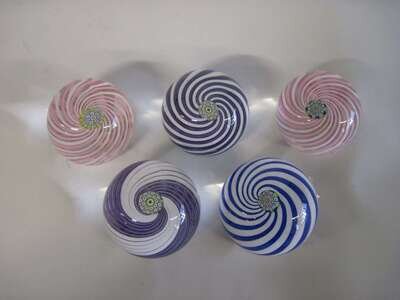 Two pink and white swirl; one blue and white swirl, one purple and white swirl; and a purple and white banded swirl, with cane centers.(5).