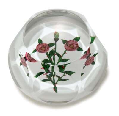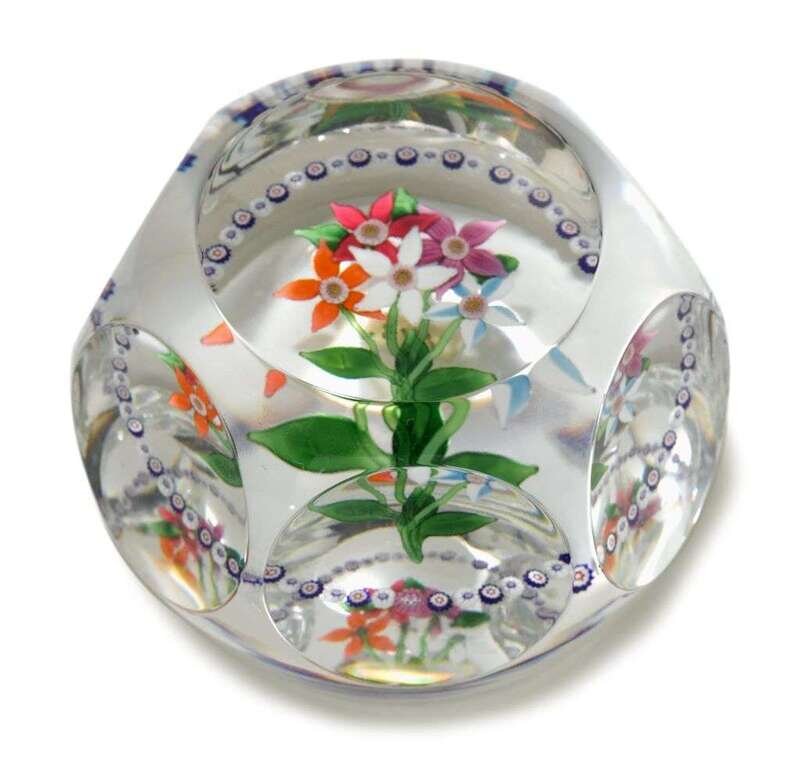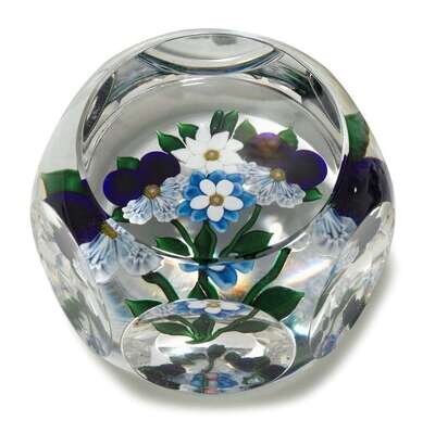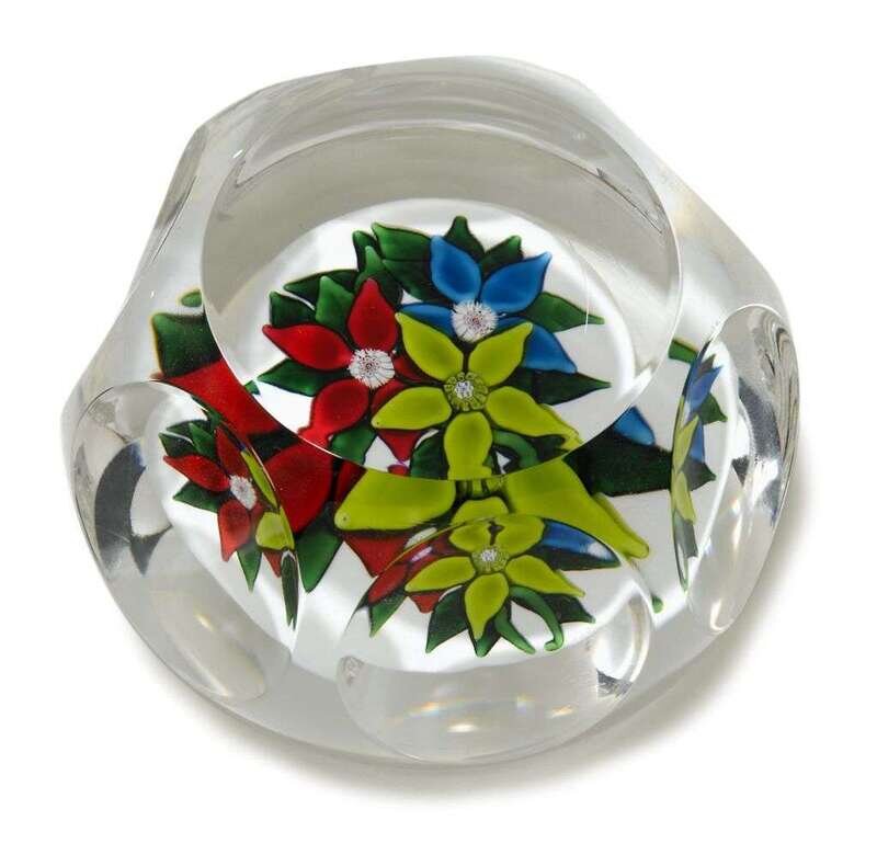 Comprising a bouquet with five flowers in orange, white, pink, purple, and blue/white with stems and leaves, in a ring of blue and white canes, SL/1977 cane, in clear glass; a bouquet with two pansies, a white flower, and a blue/white flower with stems and leaves, SL/1983 cane, in clear glass; two pink 'Clichy' style roses and bud on stems and leaves, SL/1976 cane, on a white ground; and a blue flower, red flower, and chartreuse flower with SL/1971 cane center, on leaves, against a white ground.(4).