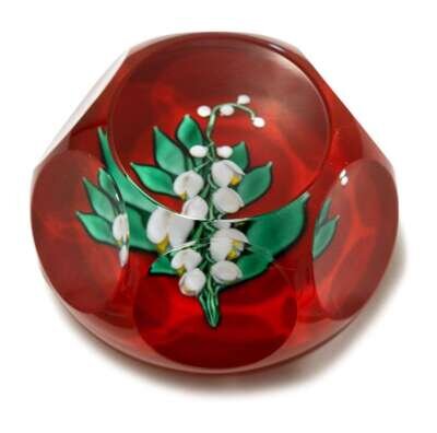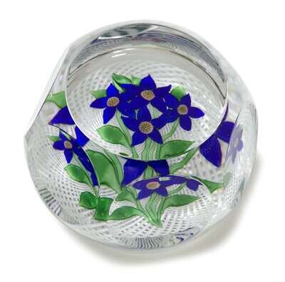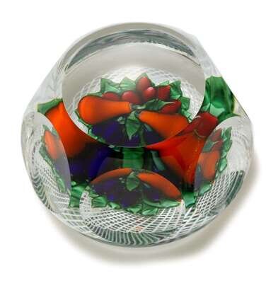 Comprising a red flower with twelve petals with SL/1970 cane center, and one bud, stem and leaves, on a blue ground; a lily of the valley with four flowers and six buds, stem and leaves, SL/1982 date cane on a red ground; two pears, six cherries and five plums on leaves, SL/1979 date cane, on white latticino; and a bouquet of four blue flowers with stems and leaves on white latticino, SL/1977 date cane.(4).