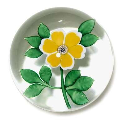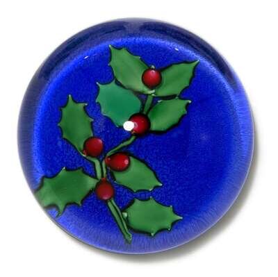 Comprising a bouquet with three blue flowers, one white flower, and one red/white flower, with leaves and stems, in clear glass, SL/1986 date cane; a yellow and white flower with leaves and stem, in clear glass, SL/1975 date cane; and a holly sprig with five berries and eight leaves, on a blue ground, SL/1985 date cane.(3).