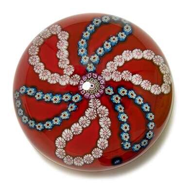 Comprising a millefiori pinwheel garland on a red ground, SL/1973 date cane; a millefiori pinwheel garland on a chartreuse ground, SL/1972 date cane; and pink and white millefiori 'doily' on a dark blue ground, SL/1972 date cane.(3).