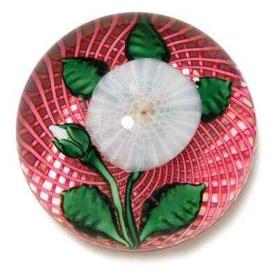 The first with a bouquet of four white and red flowers and two buds with stems and leaves, on a blue latticino ground, SL/1985 date cane; the other with a large white camelia and bud with stem and leaves, on a red latticino ground, SL/1983 cane.(2).