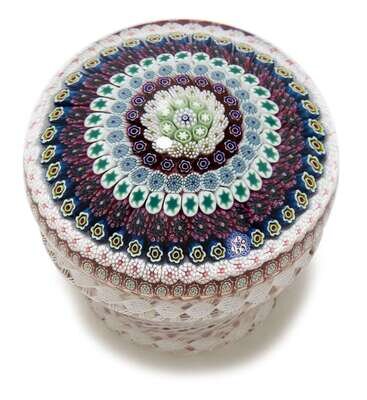 Concentric bands of pink, blue, red, green, and white, with SL/1990 date cane, on a latticino pedestal base with double torsade; no. 18/25 from a special edition for Paul Dunlop, etched mark.