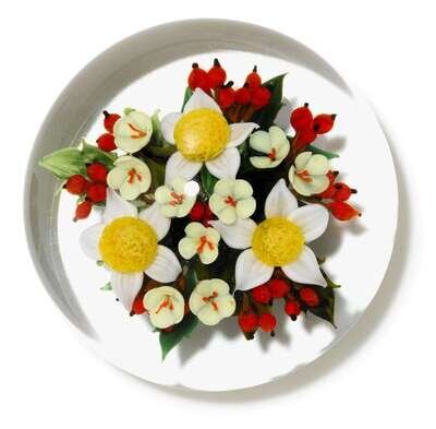 Three large white flowers with yellow centers and nine small yellow flowers, with red berries and leaves, in clear glass, signed Ayotte, Ed/50, and dated 1990.