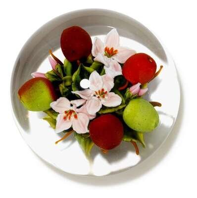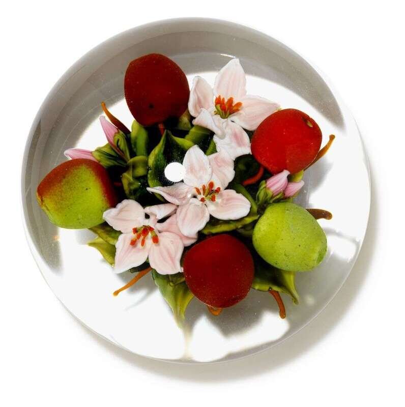 Five crabapples and three blossoms with four buds, leaves and stems, in clear glass, signed Ayotte, Ed/50, and dated 1991.