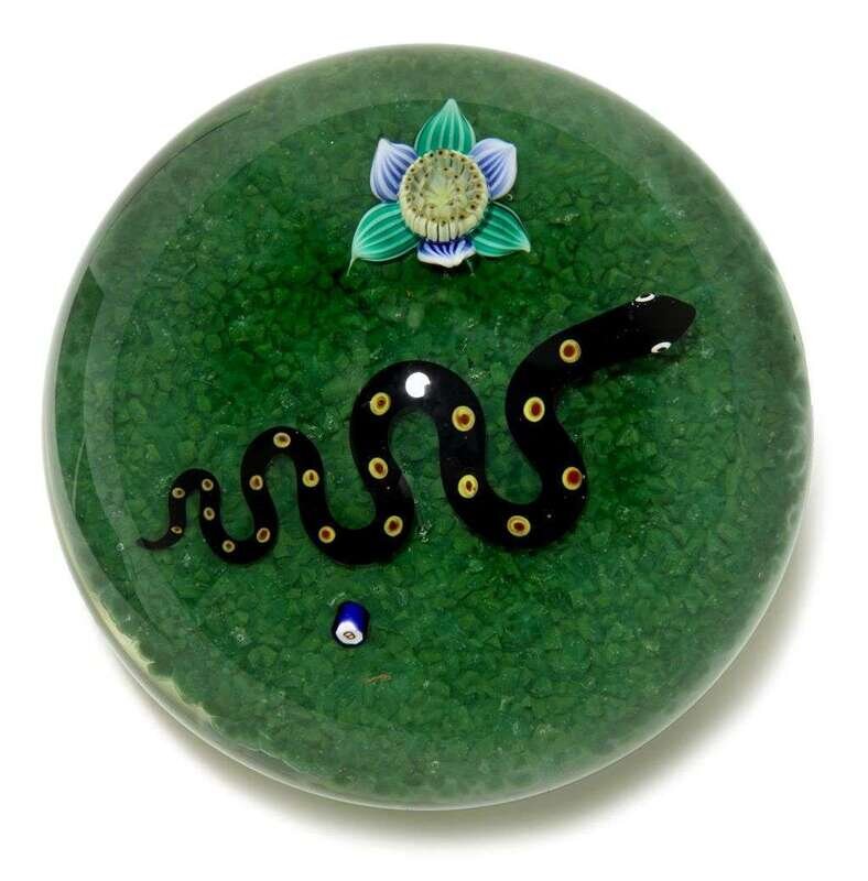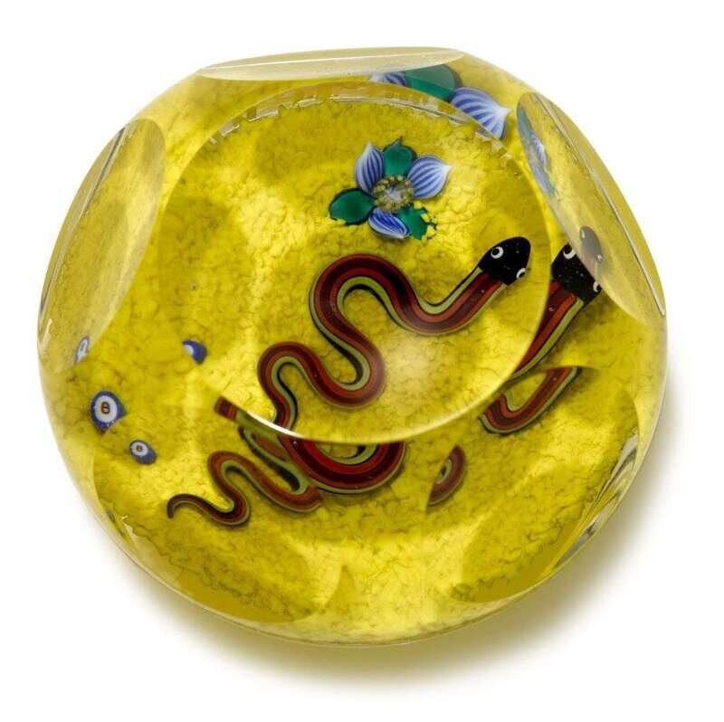 The first faceted with an orange and yellow striped snake with blue flower on a yellow sandy ground; the other with a black snake with yellow and orange spots and yellow flower on a rocky green ground; both with initial 'B' canes.(2).