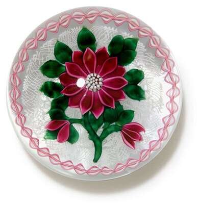 Single pink flower with white center and two buds, stem and leaves, on upset muslin, with pink and white torsade, 'B' initial cane.