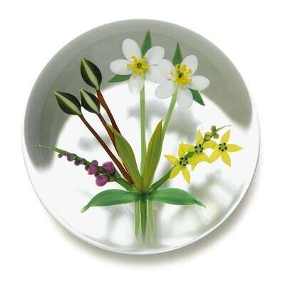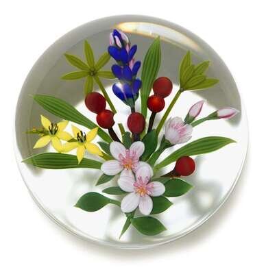 The first with three pink apple blossoms and buds, two yellow flowers, loosestrife, six bittersweet berries, and a blue lupine, with leaves and stems, Buzzini 90 cane, signed Buzzini, no. ABB 14/25; the other two white flowers with yellow centers and three buds, three smaller yellow flowers, and purple digitalis, with leaves and stems, Buzzini 88 cane, signed Buzzini, no. WFB 43; both in clear glass.(2).