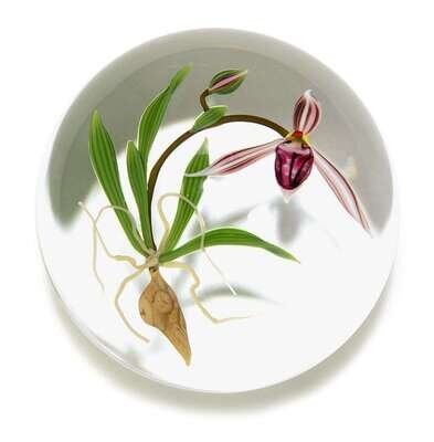 The single large pink striped flower and one bud with stem and six leaves, with exposed roots, in clear glass, Buzzini 89 cane, signed Buzzini, no. PO 5/75.