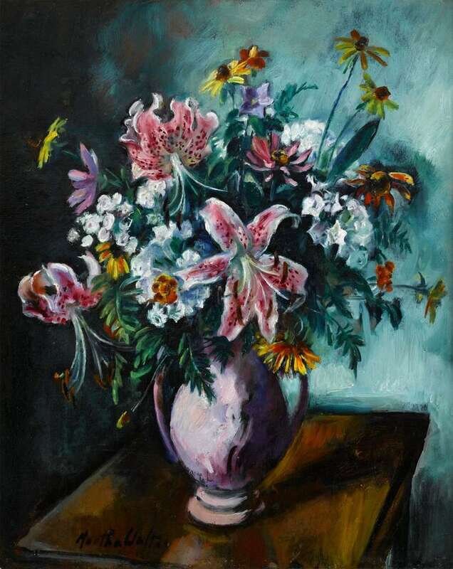 MARTHA WALTER (AMERICAN 1875-1976) VASE OF RUBRUM LILIES, BLACK EYED SUSANS, MOUNTAIN LAUREL AND OTHER MIXED FLOWERS
