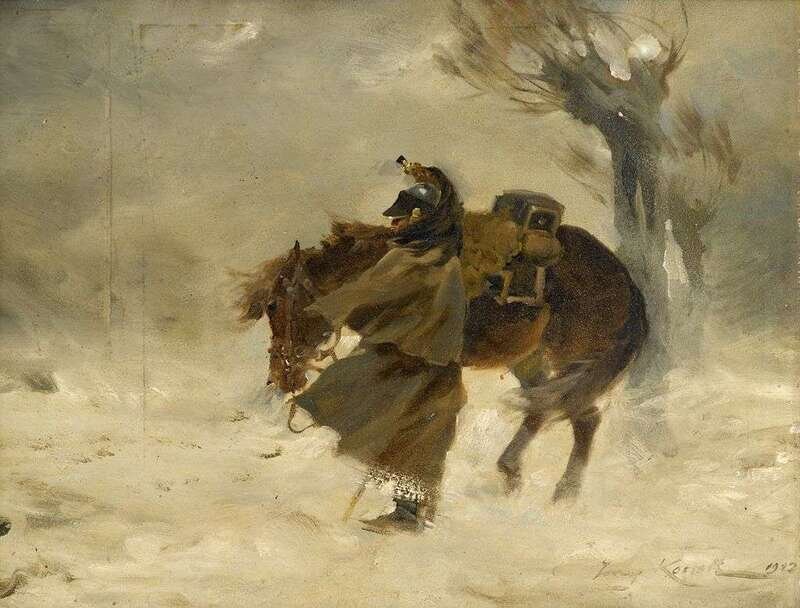 JERZY KOSSAK (POLISH 1886-1955) CAVALRY OFFICER AND HIS MOUNT, WINTER