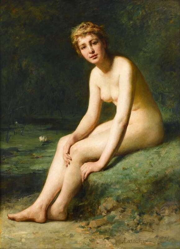 ARMAND LAROCHE (FRENCH 1826-1903) FEMALE NUDE BY POND WITH WATER LILIES