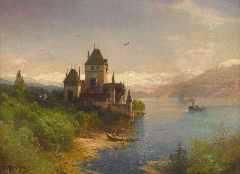 HERMANN HERZOG (AMERICAN 1832-1932) CASTLE BY A LAKE WITH A PADDLE STEAMER