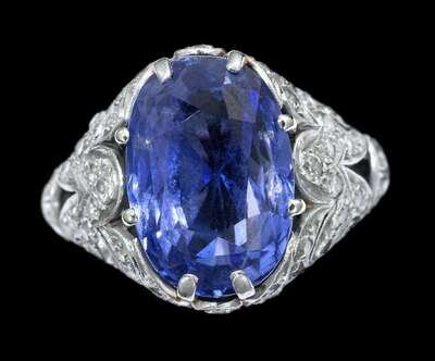 Oval cut sapphire, approxiamtely 13 carats, in filigree prong setting accented by petite single cut diamonds.