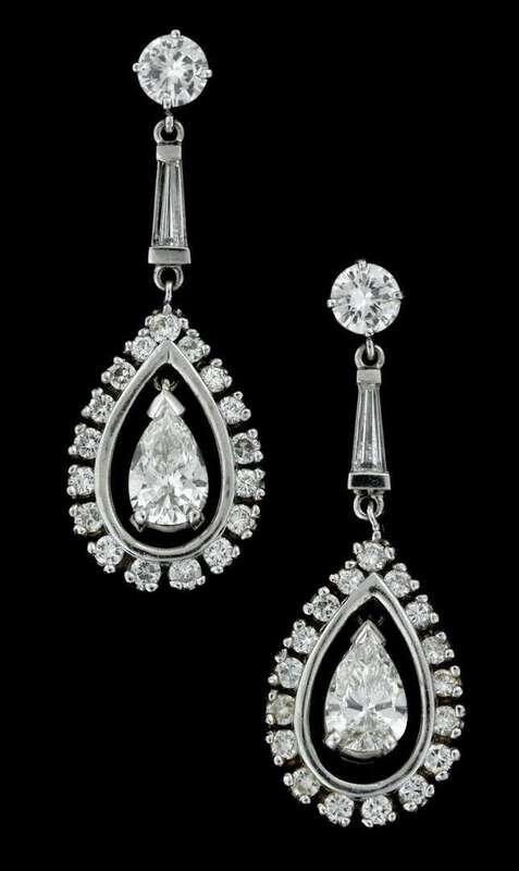 Each earring consisting of a .30 carat round cut diamond stud followed by an articulated tapered baguette displaying a single pear shaped diamond, approximately .70 carats, in a petite round cut diamond frame.