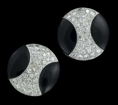 Circular earrings with onyx crescent, pave set diamond centers, post backing.