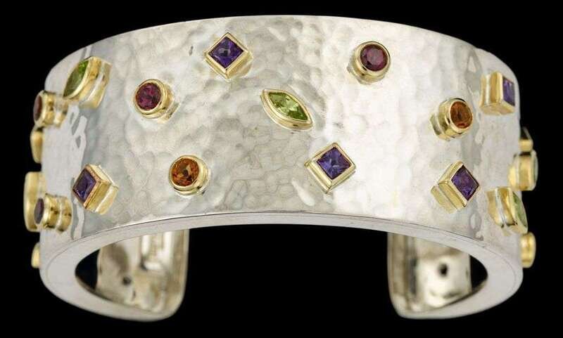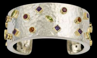 Hammered sterling silver accented by petite yellow gold bezel set gems.