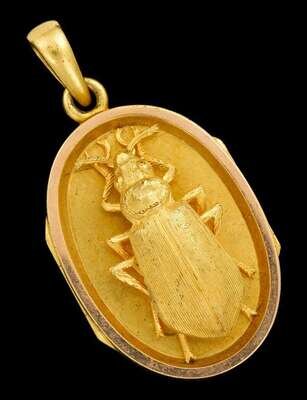 Oval locket with affixed molded beetle accent, reverse monogrammed with oversized scripted 'S'.