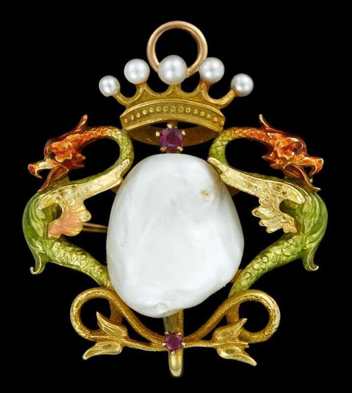 Double enameled griffins displaying white natural pearl framed by a ruby at either end and crown topper.