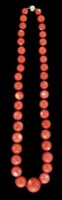 Graduated round coral beads, 11mm-26mm, 14 karat yellow gold clasp.