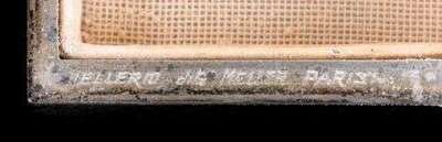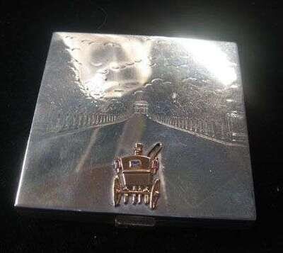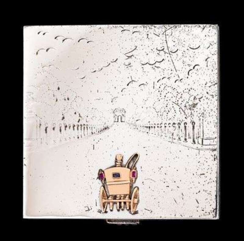 Of square form, depicting etched image of the Champs Elysee with a petite 18 karat yellow gold gem set carriage traveling toward L'Arc de Triomphe. Square cut sapphire push clasp. Original powder puff and mirror accompany the piece. Signed 925, 'Mellerio dits Meller'.