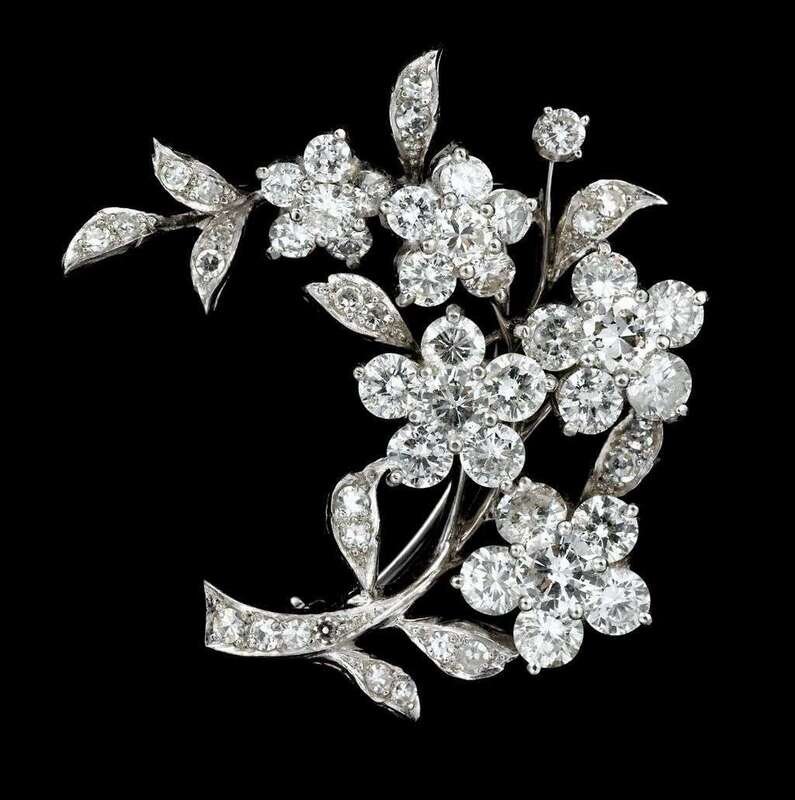 Single platinum 'branch' displays graduated blossoms, total diamond weight approximately 4.5 carats.