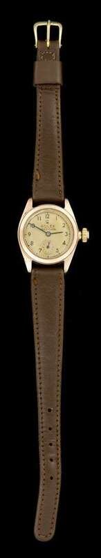 Circular cased gold tone face with Arabic numeral and dash dial, signed by the maker, displaying a subsidiary seconds hand, signed Rolex, Precision, automatic movement, stainless steel turndown back, signed serial no. 48097, brown leather band.