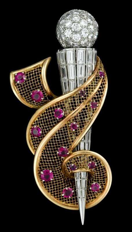 Unusual conical shaped platinum and diamond set dagger, with pave set diamond ball topper, signed by BM Co. surrounded by freeform yellow gold mesh accented by petite round cut rubies, signed by the maker.
