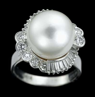 White South Sea pearl 13mm, surrounded by petite baguette cut diamond and graduated round cut diamond alternating waves.