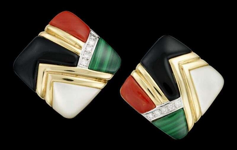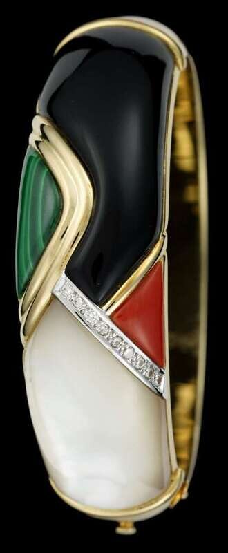 Abstract mosiac bangle bracelet displays mother-of-pearl, onyx, malachite and coral tiles, accompanied by matching clip earrings.