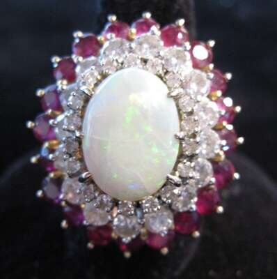 Oval white opal pron set and framed by eighteen petite round cut diamonds, followed by sixteen round cut diamonds and a twenty round cut ruby frame.