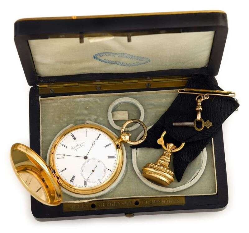 Circular cased white enamel face with Roman numeral and dash dial, signed by the maker, Copenhagen, subsidiary seconds hand, inner back case signed by maker again, serial no. 6234/3250, key wind movement, accompanied by original box and key.