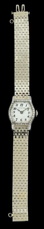 Platinum and diamond cased white enamel lozenge shaped face, Arabic and dash dial, with flexible 14 karat white gold wristband.