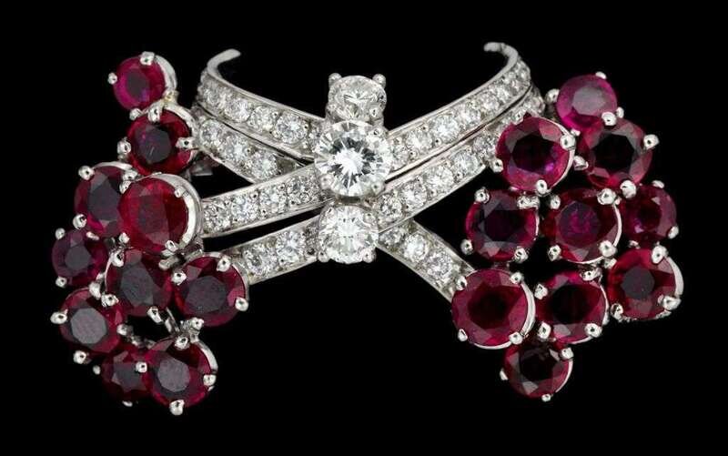 Center displaying three graduated diamonds followed by pave diamond set 'ribbons' finishing is bright ruby clusters.