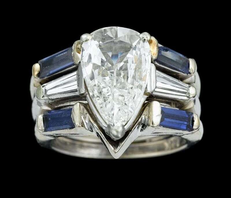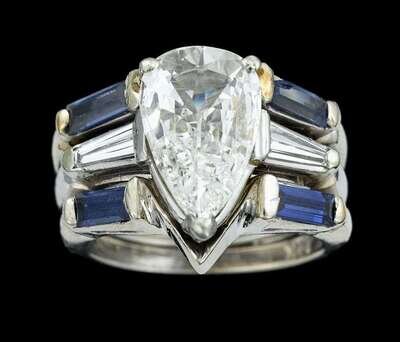 Approximately 2 carat pear shaped diamond prong set and framed by a tapered baguette diamond and a sapphire tapered baguette.