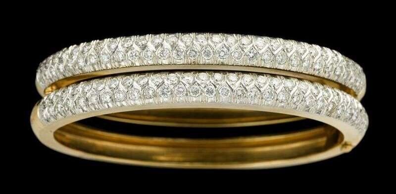 Double 14 karat yellow gold and diamond bangle bracelets.