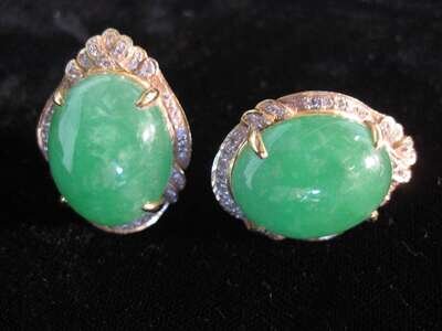 Oval jade cabochons prong set into petite round cut pave set diamond frame, post and omega French backing.