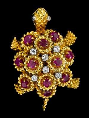 18 karat yellow gold ruby and diamond 'turtle' brooch