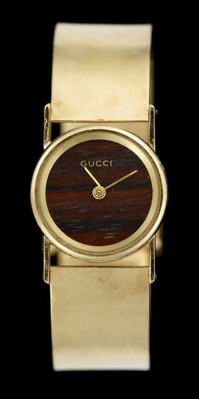 Circular cased wood grain face with numberless dial signed by the maker, 18 karat yellow gold wristband, mechanical movement. Displays French hallmarks on band and case.