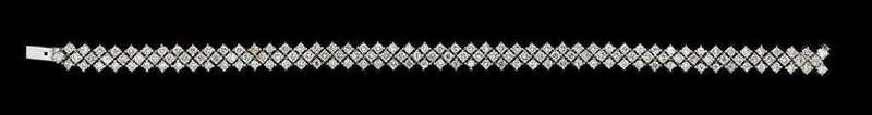 Articulated triple row flexible bracelet displays one hundred fifty round cut diamonds, approximately 7.5 carats total weight.