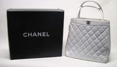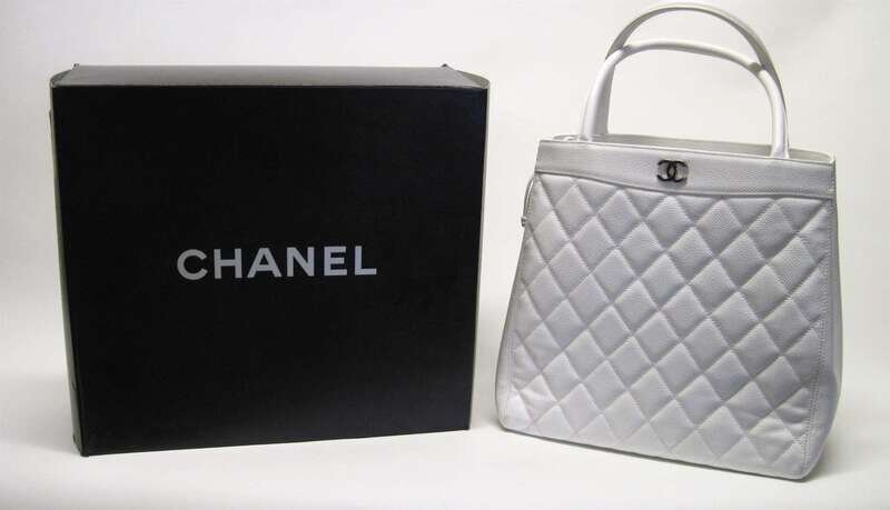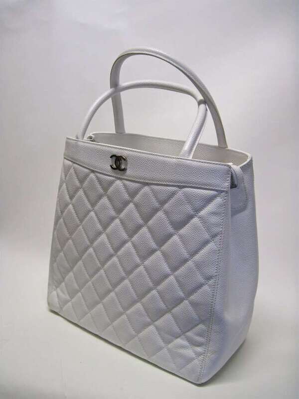 Tall white tote bag of quilted caviar leather, small 'CC' logo at top, short handles. Accompanied by original gift box.