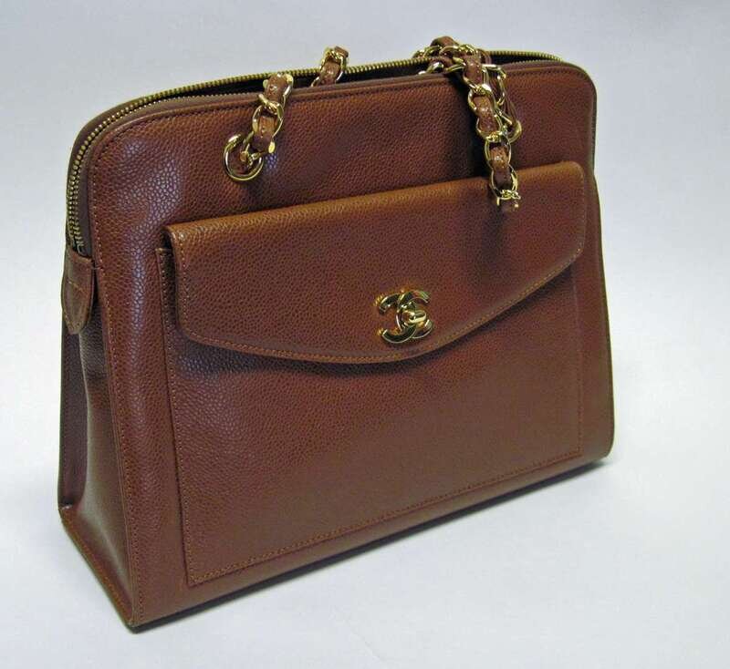 Caviar leather exterior with front foldover patch pocket with double 'CC' clasp, double interior zip compartments and double chain shoulder straps. Accompanied by original dust bag.
